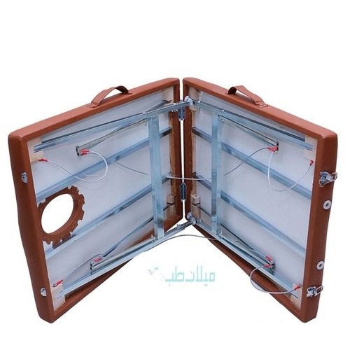 تخت ماساژ تاشو پرتابل پایه استیل یک تخت ماساژ تاشو و قابل حمل است که وسیله ای بسیار مناسب برای ماساژور های سیار می باشد . این تخت یک شکن می باشد ، به این معنا که تخت دارای یک لولا در مرکز تخت بوده که بوسیله ی این لولا می توان تخت را تا کرد . همچنین پایه های این تخت نیز تاشو هستند و با خود تخت تا شده و به شکل چمدان در می آیند . جنس پایه های تخت استیل می باشد که مقاومت و دوام تخت را دوچندان می کند .